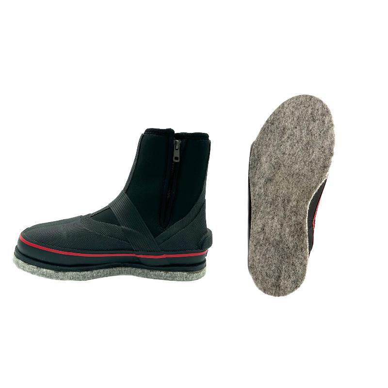 Felt-soled fishing shoes with compressed felt soles provide grip on a variety of difficult terrain. Use thick cut soles to combat sole wear. The interior can be made with separated toes. The reinforcement around the toes and base has been improved. The neoprene shoes are great for protecting your feet from water pressure and stones.